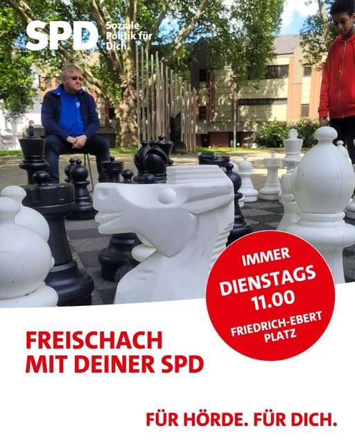 Ab Dienstag 29. April heißt es wieder Schachmatt auf dem Friedrich-Ebert-Platz! Nach dem regen Interesse der letzten Jahre wird es wieder ein offenes, regelmäßiges Schachangebot bei trockenen Wetter geben.