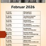 Hier kann man das ganze Programm für Februar herunterladen. Beachtet bitte den unterschiedlichen Beginn der Veranstaltungen: Mitsingabend und Karaoke 18:00, Kurzfilme 19:30, Konzerte 20:00