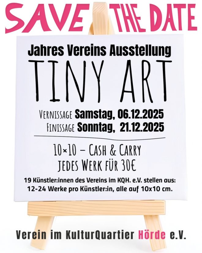 Die Künstlerinnen und Künstler des Vereins im Kulturquartier Hörde e.V. stellen in ihrer dritten JahresVereinsAusstellung mit 10 x 10 cm Leinwänden unter dem Thema ,,Tiny Art” vor!