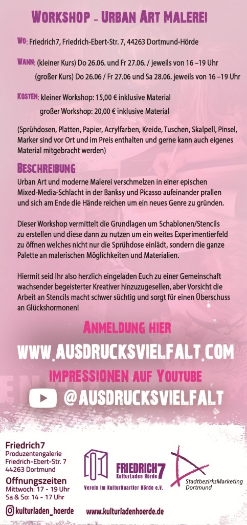 Beschreibung: Urban Art und moderne Malerei verschmelzen in einer epischen Mixed-Media- Schlacht, in der Banksy und Picasso aufeinanderprallen und sich am Ende die Hände reichen, um ein neues Genre zu gründen. Dieser Workshop vermittelt die Grundlagen, um Schablonen/Stencils zu erstellen und diese dann zu nutzen, um ein weites Experimentierfeld zu öffnen, das nicht nur die Sprühdose einlädt, sondern die ganze Palette an malerischen Möglichkeiten und Materialien. Hiermit seid ihr also herzlich eingeladen, euch zu einer Gemeinschaft wachsender begeisterter Kreativer hinzuzugesellen. Aber Vorsicht, die Arbeit an Stencils macht schwer süchtig und sorgt für einen Überschuss ein Glückshormonen