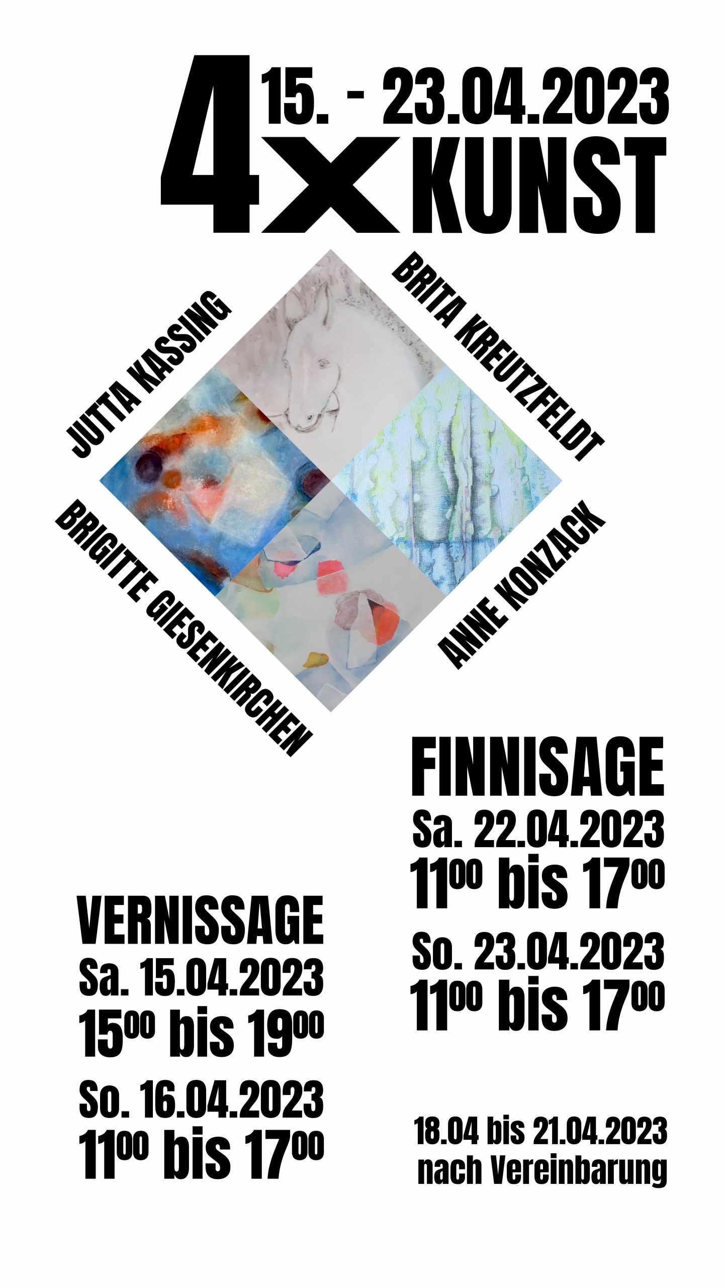 wir laden euch herzlich zur Ausstellung „4 x Kunst“ von den Künstlerinnen Brita Kreuzfeldt, Anne Konzack, Brigitte Giesenkirchen und Jutta Kassing ein.
