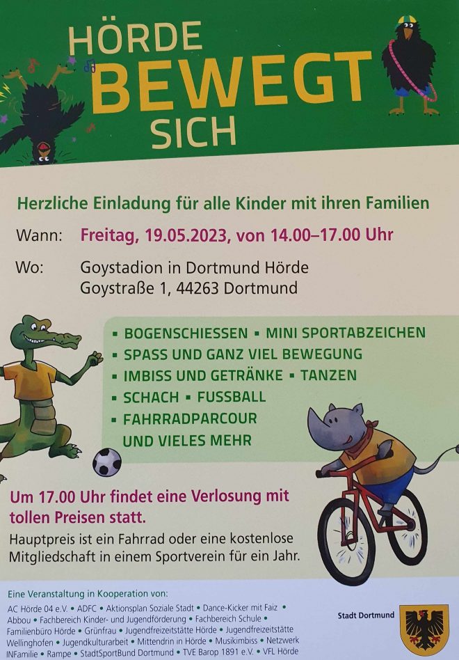 Auf dem Programm stehen Bogenschießen, Mini-Sportabzeichen, Spaß und ganz viel Bewegung, Imbiss und Getränke, Tanzen, Schach und Fußball, Fahrradparcour und vieles mehr.